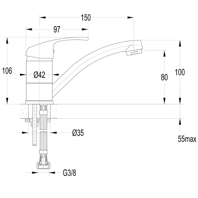 Umývadlová batéria AQUALINE 35 je klasikou medzi batériami. Je praktická, funkčná a ponúka jednoduchý design za nízku obstarávaciu cenu. Vďaka ramienku s dĺžkou 15 cm je vhodná do väčších umývadiel, jej výška je 106 mm.