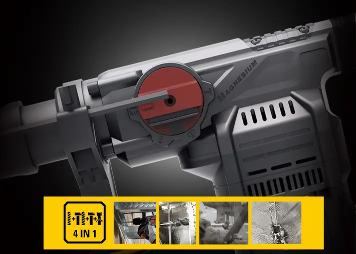 Rotačné vŕtacie kladivo je vybavené antivibračnou hlavnou rukoväťou, spínačom zamykania a variabilným ovládaním rýchlosti. Na lepší úchop slúži gumová rukoväť. Ďalšou súčasťou vybavenia je rýchlovýmenný systém SDS-plus, prevodovka z horčíkovej zliatiny a kovový hĺbkomer. Kladivo má štyri funkcie: vŕtanie, vŕtanie s príklepom, otáčanie vrtákov, kosenie. Napájací kábel je plne chránený pripojením kábla s guľovým kĺbom.