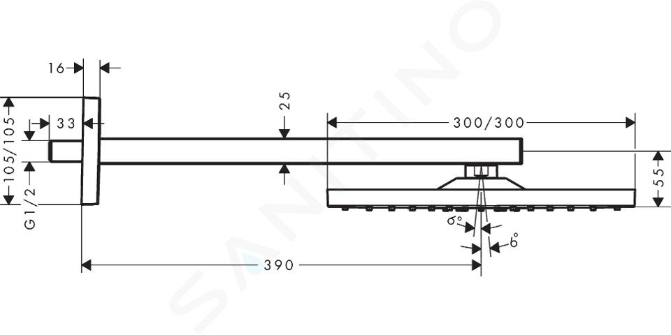 Hlavová sprcha prináša do každej domácnosti nevšednú príležitosť rozšírenia sprchových možností. Z bežnej očisty sa razom ocitnete na poli kúpeľného prostredia, ktoré s vaším telom i psychikou dokáže divy. Horná sprcha hansgrohe Raindance E popri spoľahlivej funkčnosti ponúka aj estetický zážitok. Čierna farba povrchov zaujme na prvý pohľad, rovnako ako pôsobivé rozmery štvorcovej hornej sprchy. Dĺžka strany je 300 mm. Vodné lúče prúdu RainAir vás teda bezpečne obklopia a zaistia úľavu, aj dokonalú očistu. Vďaka primiešanému vzduchu sa vodné kvapky navyše stávajú jemnejšími, plnšími a menej sa rozstrekujú. Výhodou je tiež guľový kĺb, ktorý umožňuje nastaviť uhol hornej sprchy.
