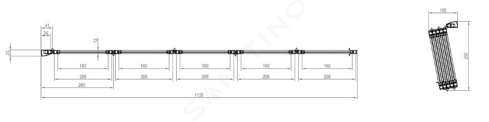 Zástena sa skladá z 5 pohyblivých dielov, ktoré je možné úplne zložiť do vnútorného priestoru nad vaňu. Má rozmery 1135 x 1330 milimetrov a je vyrobená z plastu. Profily majú decentné biele vyhotovenie. Výplne sú úzke, takže po zložení zásteny zostáva na okraji vane veľa miesta.