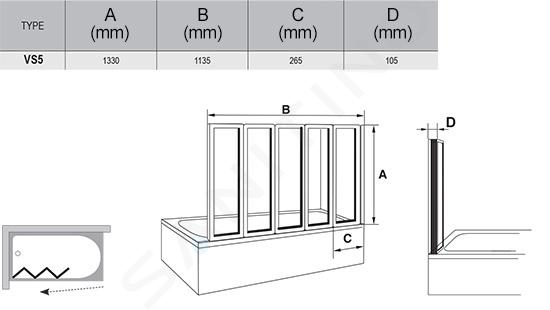 Vaňová zástena VS5 má v zloženom stave šírku 223 mm. Otočením vaňovej zásteny VS5 o 180° získame variant vstupu sprava či zľava.